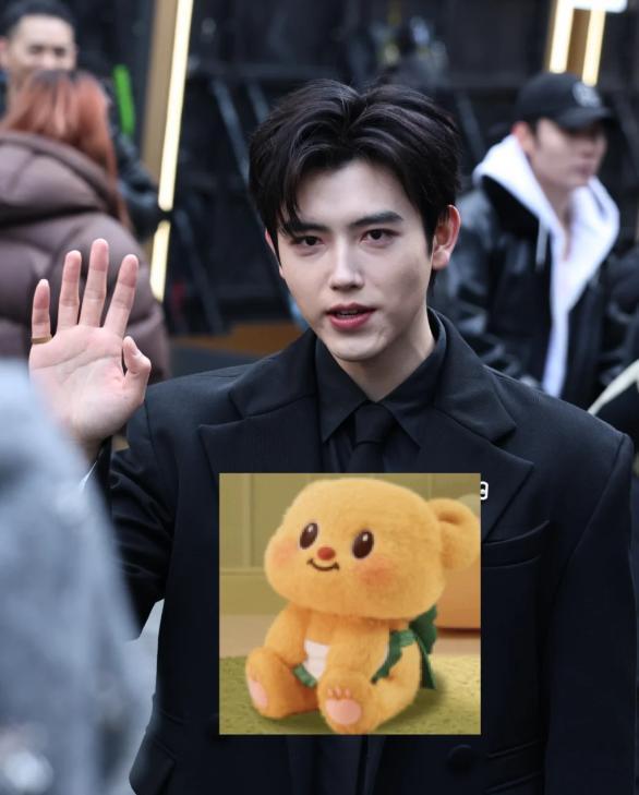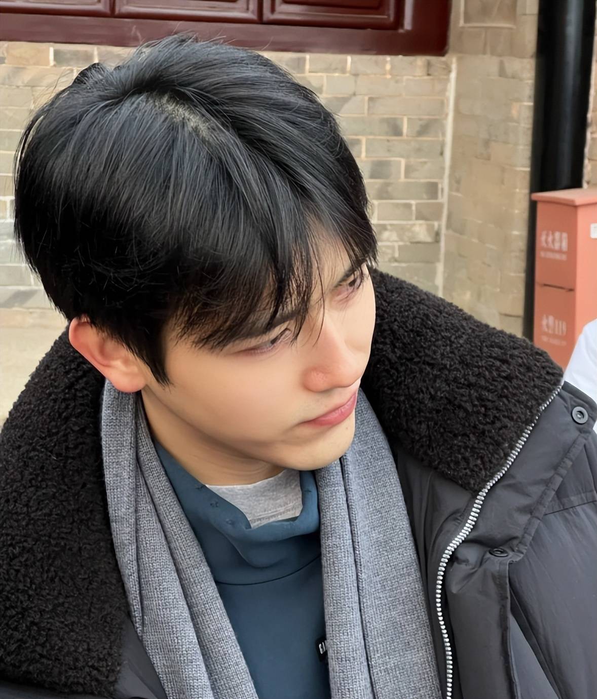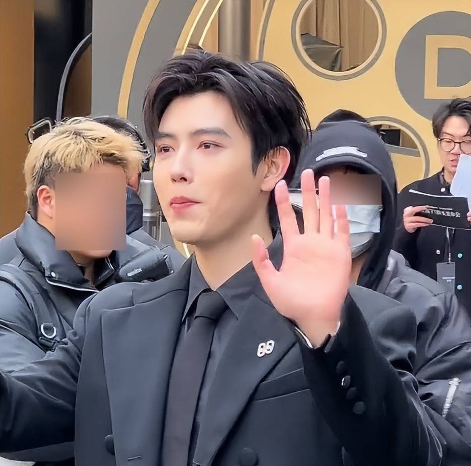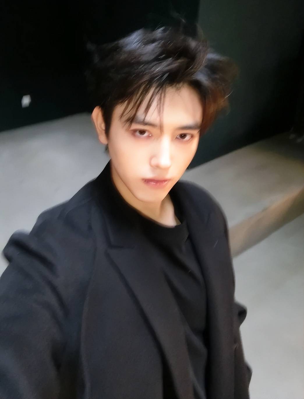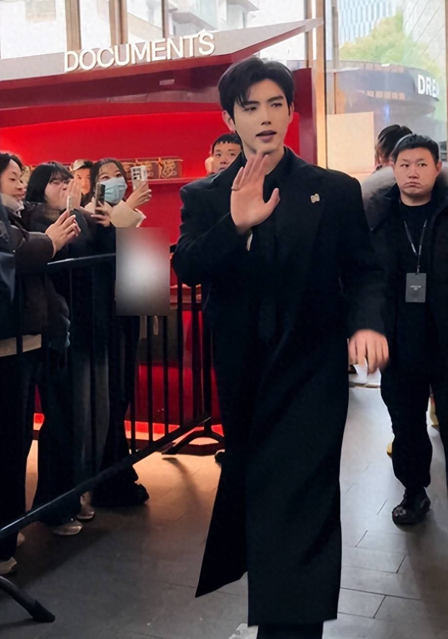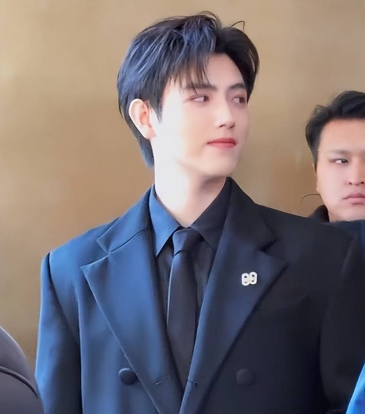大衣里面是一身黑色西装,搭配黑色领带,正式感十足,可这样的穿搭却和他的素颜状态形成了强烈反差。