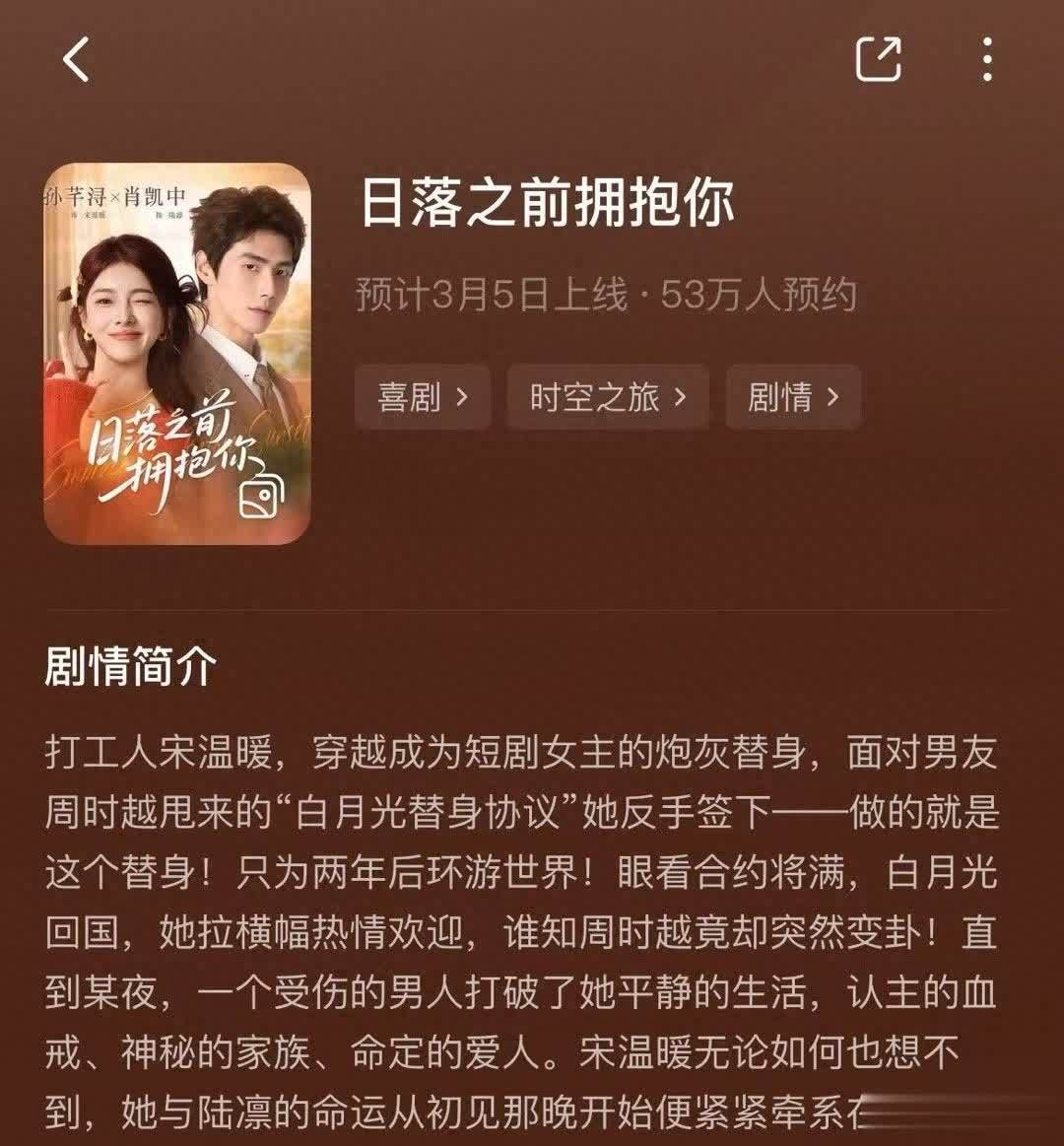 《日落之前拥抱你》,由李梦然导演, 肖凯中、孙芊浔带头主演,将会在3月5号0点正式在抖音上线股指配资,这部现代轻喜剧短剧还没开播,预约人数就已经超过60万,妥妥的开年爆款预定